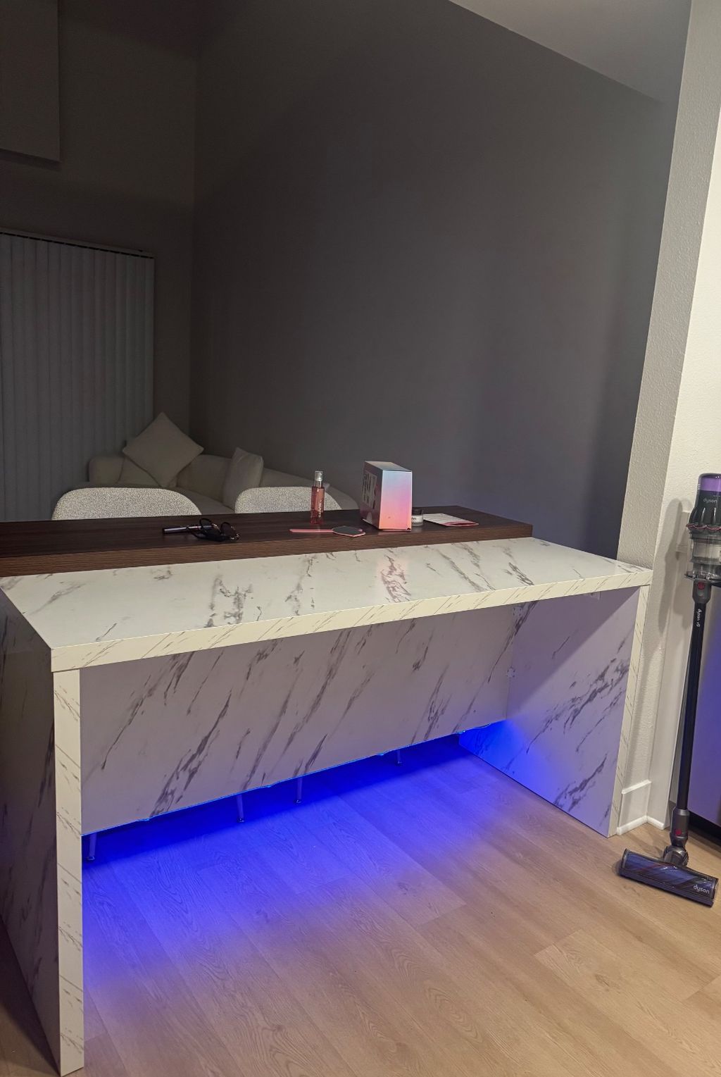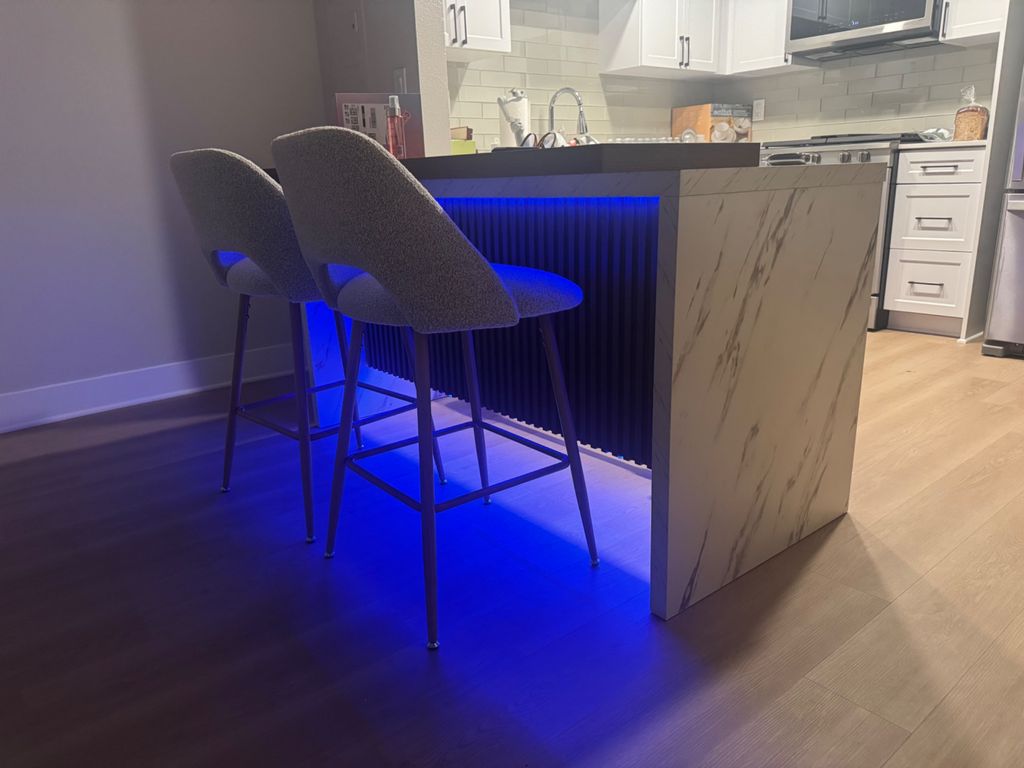 Assembled a custom kitchen bar with marble panels, wood top and built-in LED lighting. Strong, clean and modern result. Thank you so much Goga .