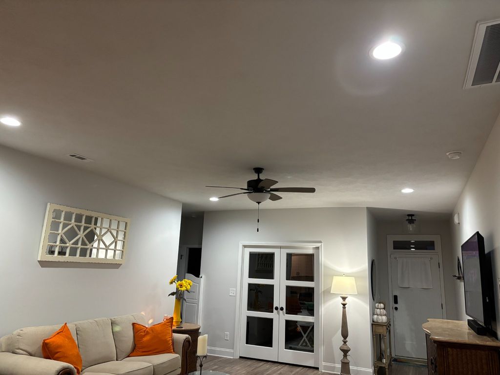 Details: Replacement of existing lighting • 2-4 lights • 8 - 10 feet (standard ceiling) • Indoors • Existing property • House