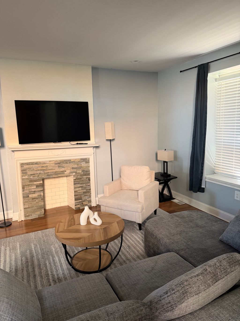 Details: Wall mount above fireplace • Drywall • TV smaller or equal to 60 inches • No, there’s no electrical outlet nearby • No, I don’t need to conceal cables and wires • Yes, I already have a mount or stand • Tilt (angled up or down) • Sound bar