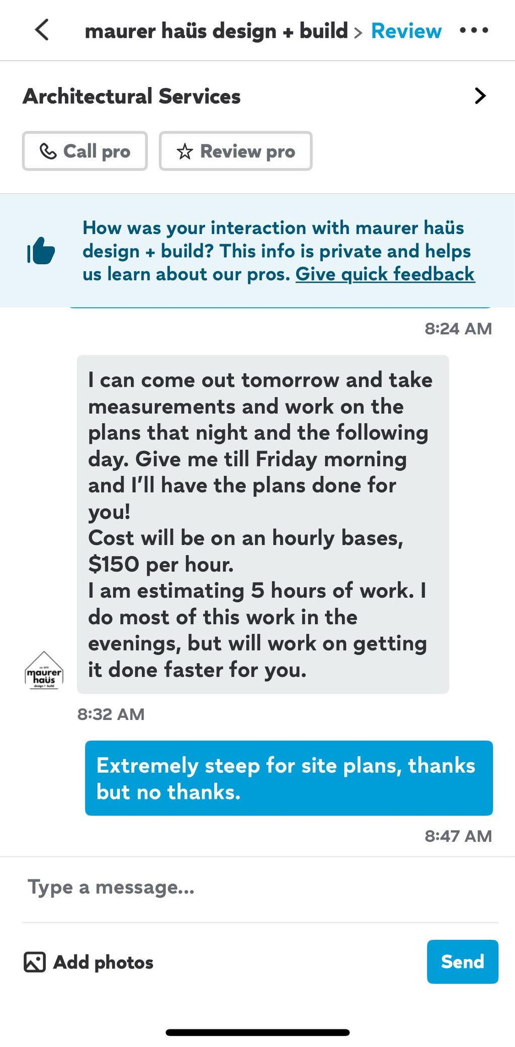 My fees are as follows: Free first consultation meeting New construction: $2.50 per square foot up to 40 work hours, then it is an additional $1.50 an hour. Changes to plans $1.50 an hour. Remodel/Addition $1.50 an hour. Site plans are $175 flat rate. 30% deposit to get started on any work.