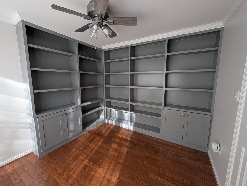 Details: Cabinets, shelves, or bookcases • Baseboards and/or crown molding • New custom building or construction • Residential